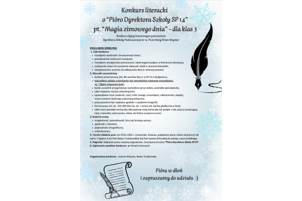 Konkurs literacki o “Pióro Dyrektora Szkoły” pt.“Magia zimowego dnia”- dla klas 3