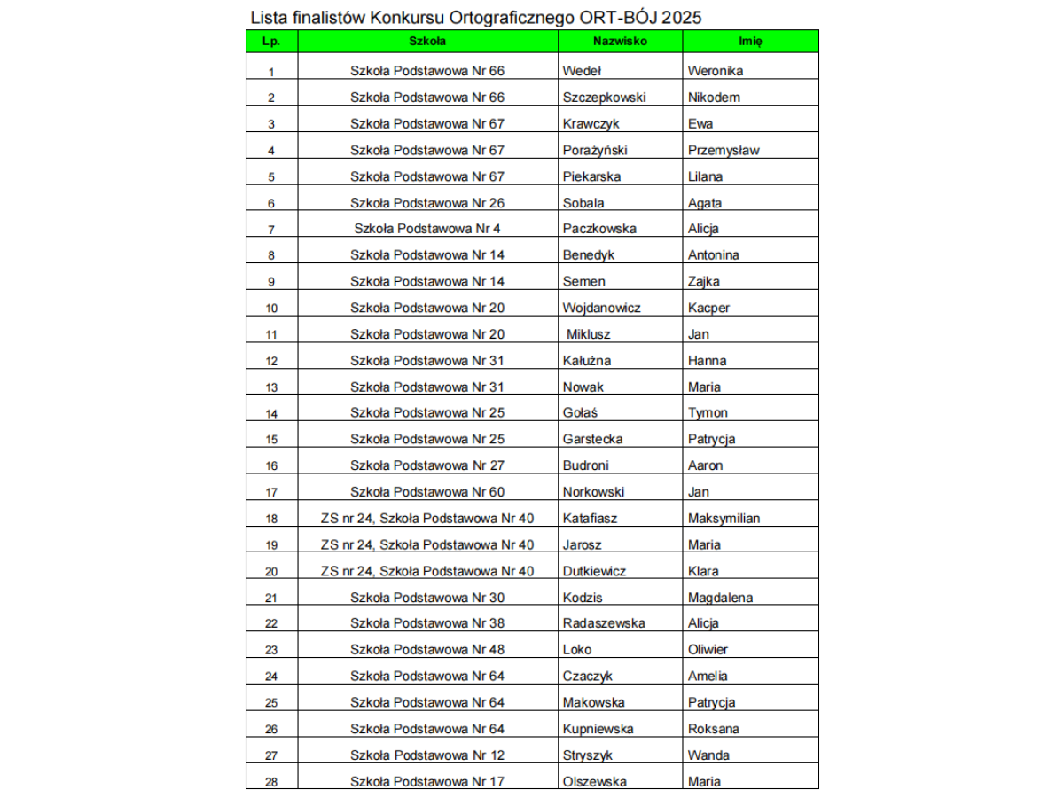 W dniu 10.04.2025r. w czterech bydgoskich szkołach odbył się etap rejonowy 26. Miejskiego Konkursu Ortograficznego „Ort-Bój” dla uczniów klas trzecich. Wzięło w nim udział 129 uczniów z 27 bydgoskich szkół. Po analizie wyników do finału zakwalifikowano 28 dzieci, które popełniły maksymalnie 3,5 błędu.