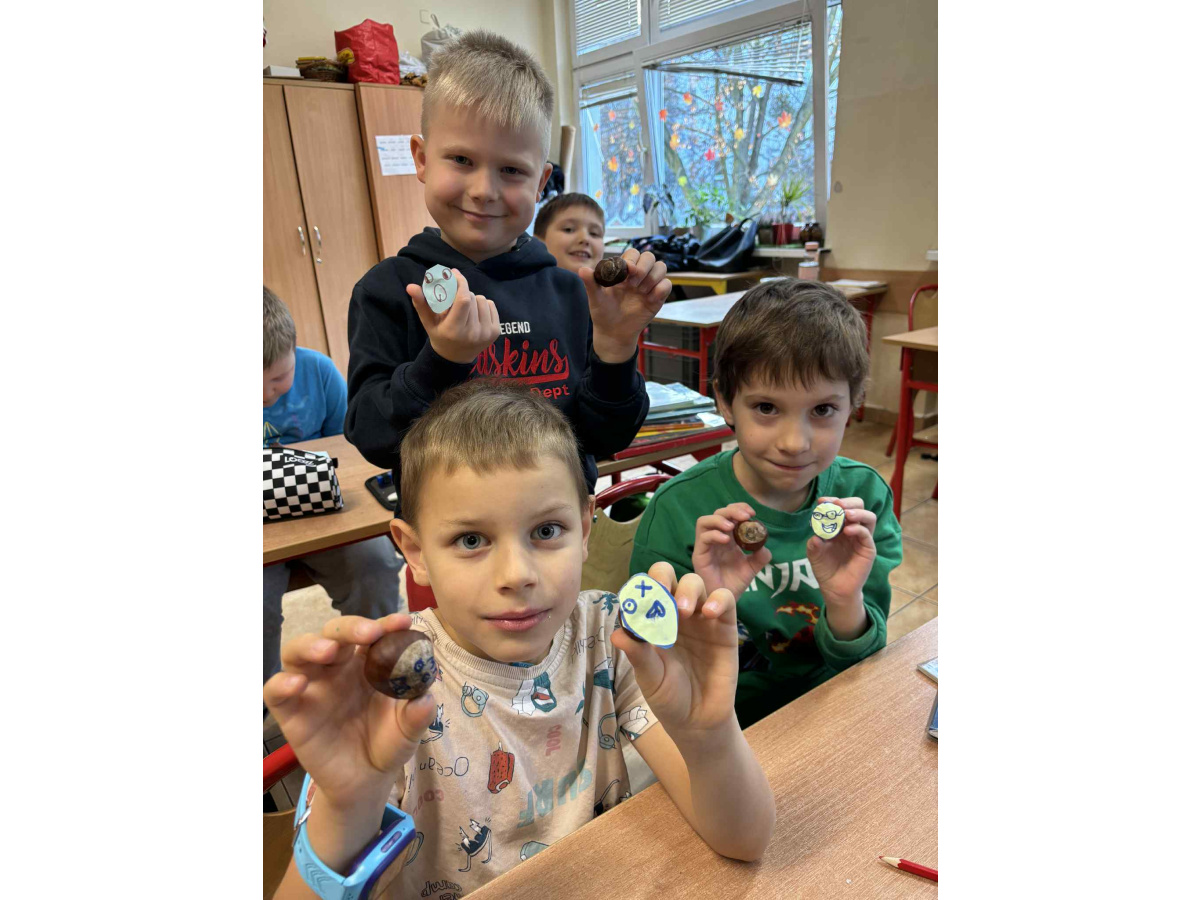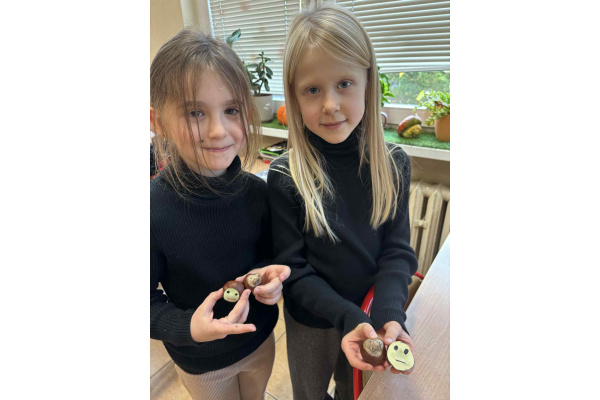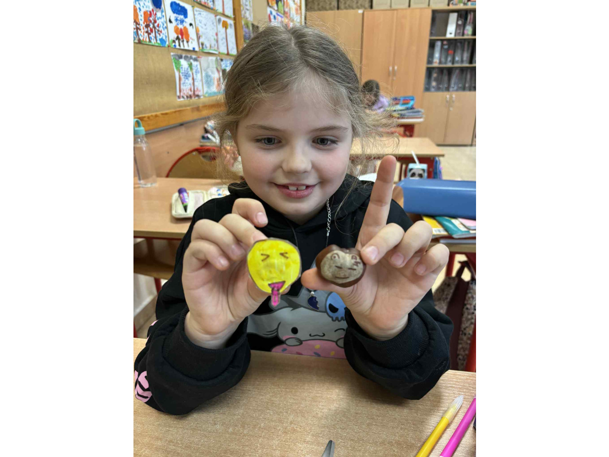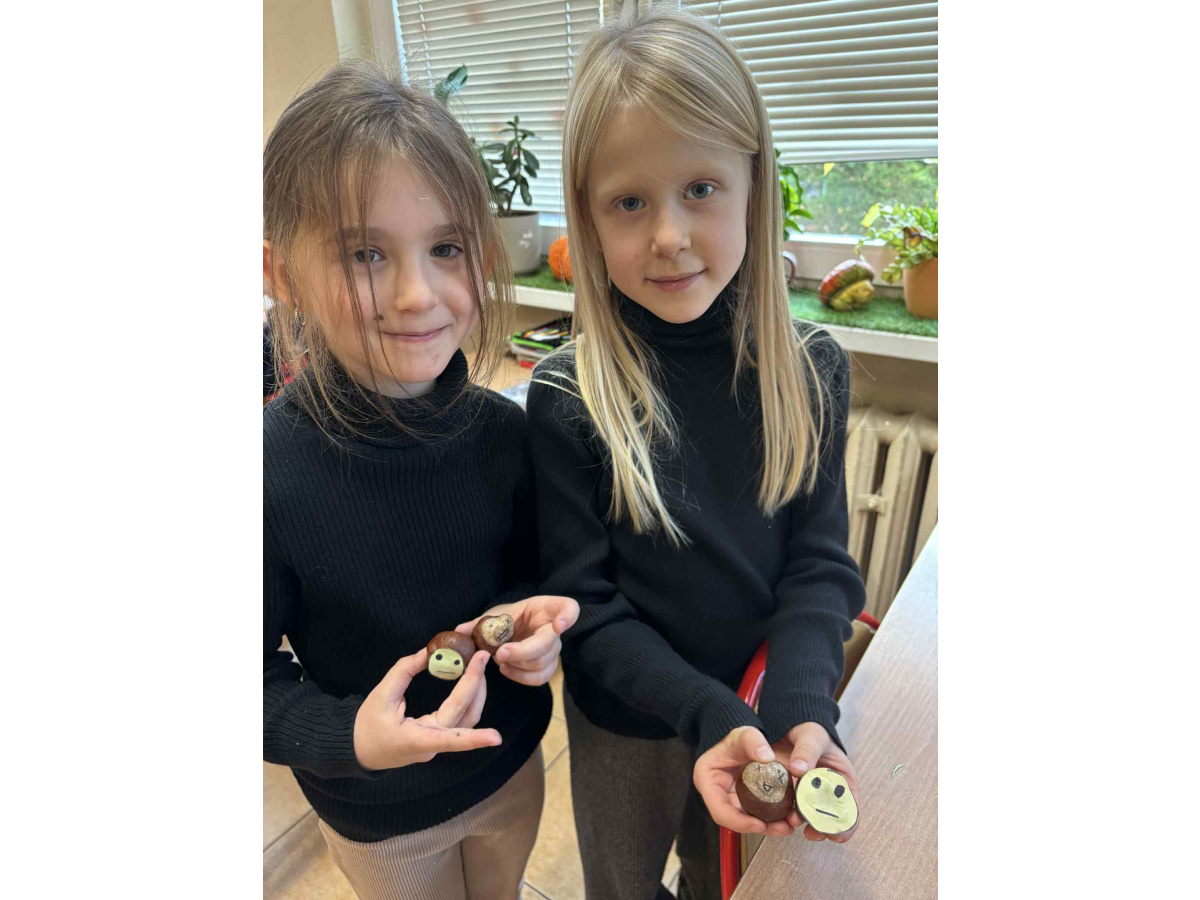 Część uczniów z klas 1-3 przygotowała EmoKasztany - kasztany z narysowanymi sympatycznymi emotkami i wymieniały się między sobą oraz między innymi klasami.