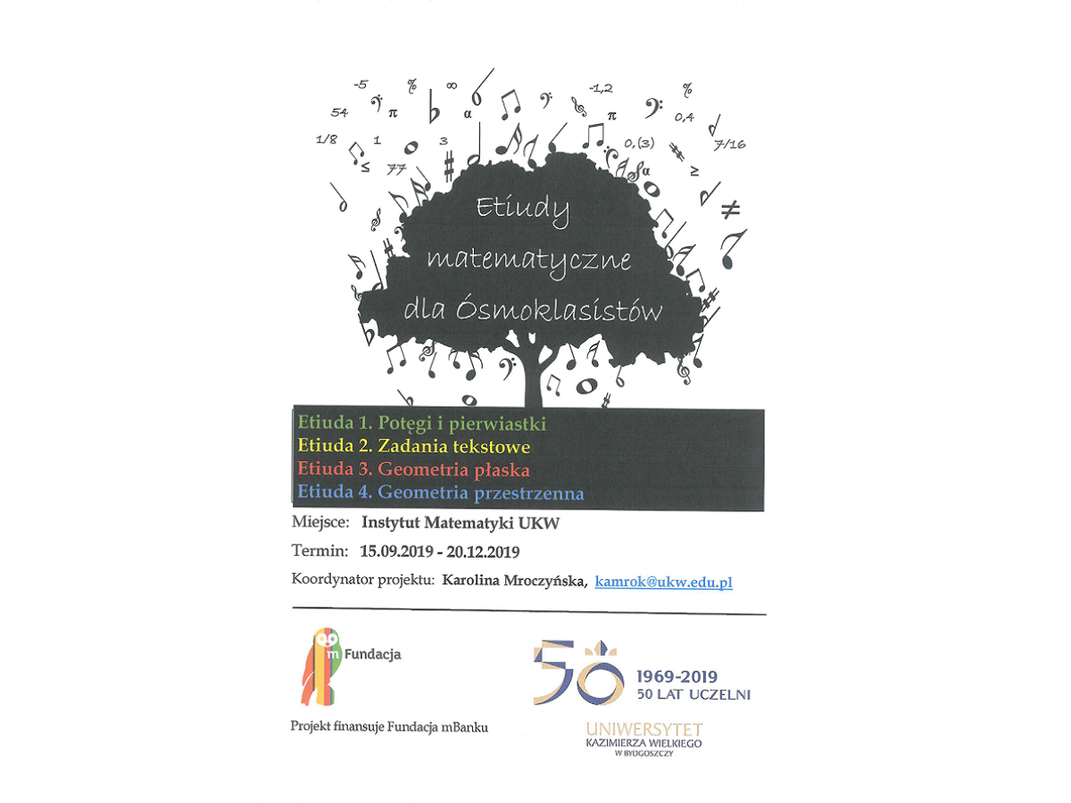 Zapraszamy uczniów klas ósmych do udziału w projekcie edukacyjnym „Etiudy matematyczne dla ósmoklasistów”. Projekt zakłada przeprowadzenie 12h zajęć warsztatowych mających na celu:
