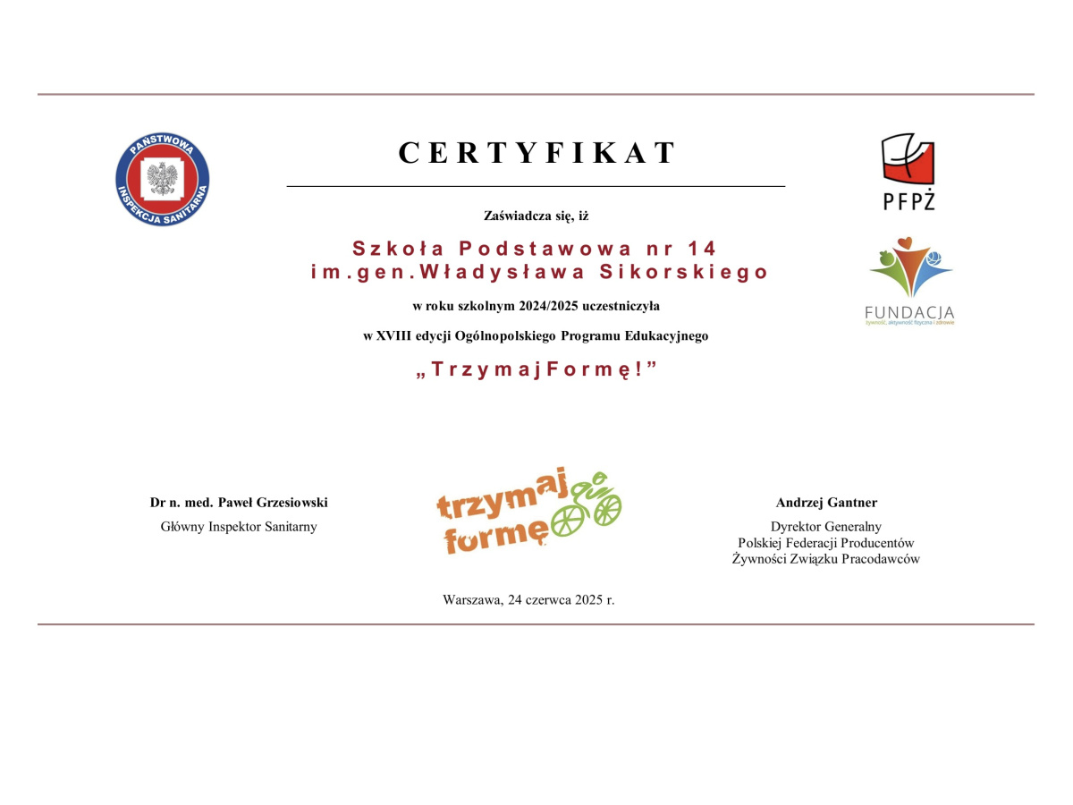 Z przyjemnością przekazuję informację o finale realizacji projektu „Trzymaj Formę!” przez Szkołę Podstawową nr 14 w Bydgoszczy, który odbywał się w bieżącym roku szkolnym. Celem projektu było promowanie zdrowego stylu życia, prawidłowych nawyków żywieniowych oraz aktywności fizycznej wśród uczniów. Koordynatorem projektu była Pani Joanna Karpińska.