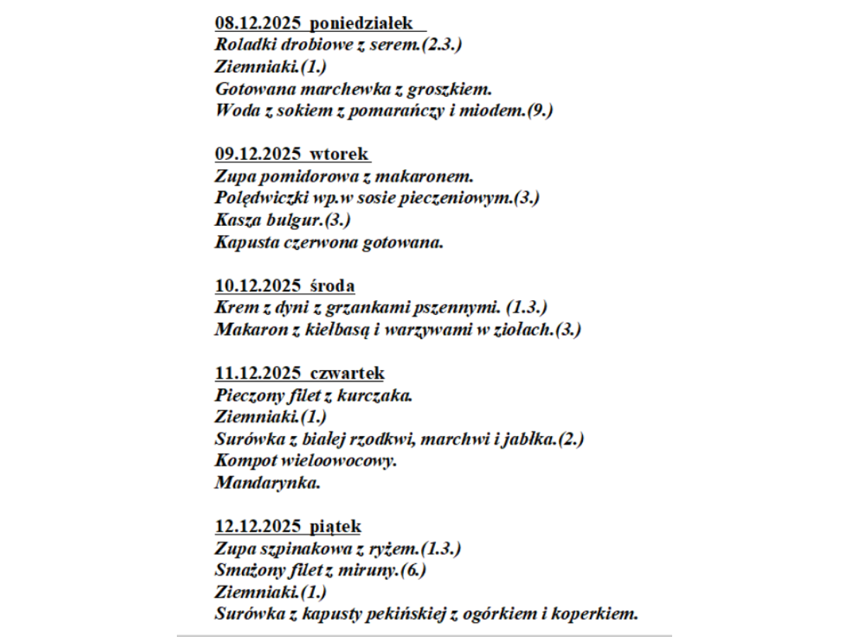 Zgodnie z Rozporządzeniem Parlamentu Europejskiego i Rady (UE) nr 1169/2011 w sprawie przekazywania konsumentom informacji na temat żywności – ze szczególnym uwzględnieniem alergenów (załącznik na dole strony) .W związku z powyższym w jadłospisie zamieszczony jest numer oznaczający alergeny jakie potrawa zawiera.