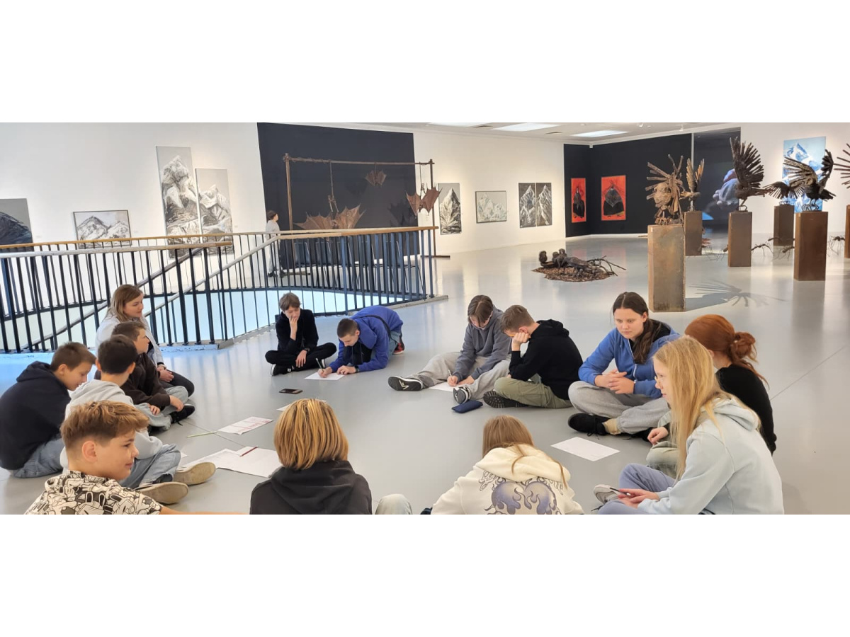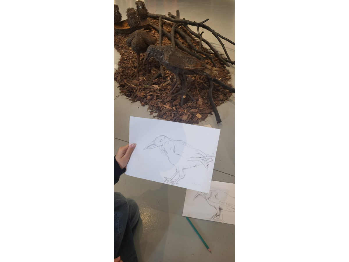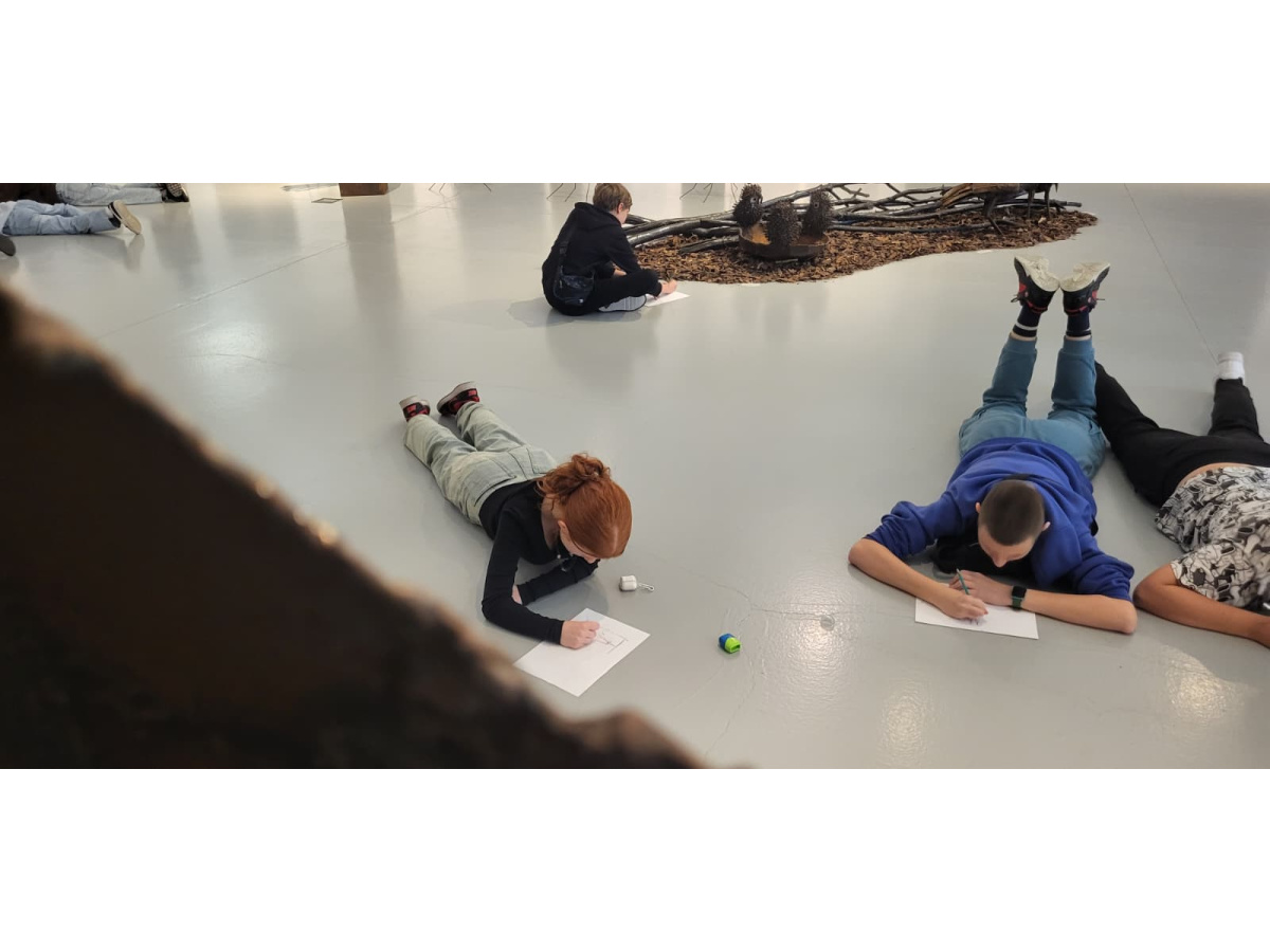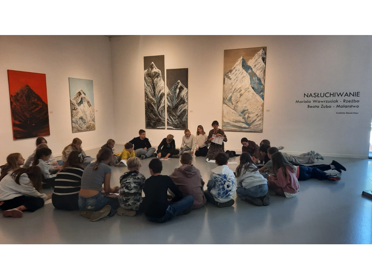 Podczas zajęć zwiedziliśmy wystawy „Nasłuchiwanie. Mariola Wawrzusiak – Rzeźba” oraz „Beata Zuba – Malarstwo”. Uczniowie dokonywali obserwacji i analizy dzieł sztuki, wykorzystując rutynę krytycznego myślenia „Widzę, myślę, zastanawiam się…”. Odpowiedzi na swoje refleksje odnaleźli m.in. w filmie dokumentalnym „Rdza”, a następnie wykonali szkice lub fotografie prezentowanych rzeźb.