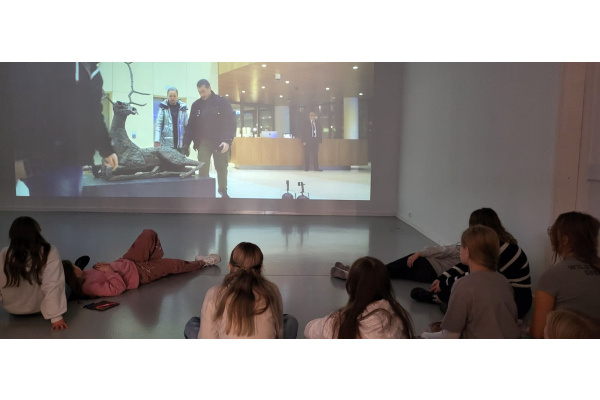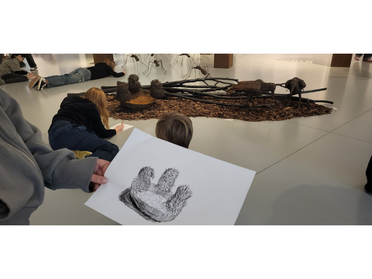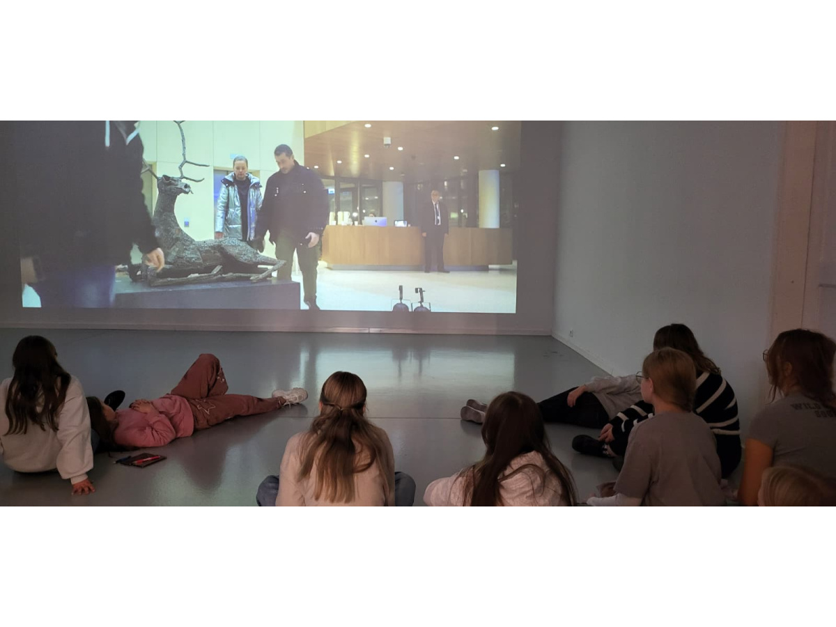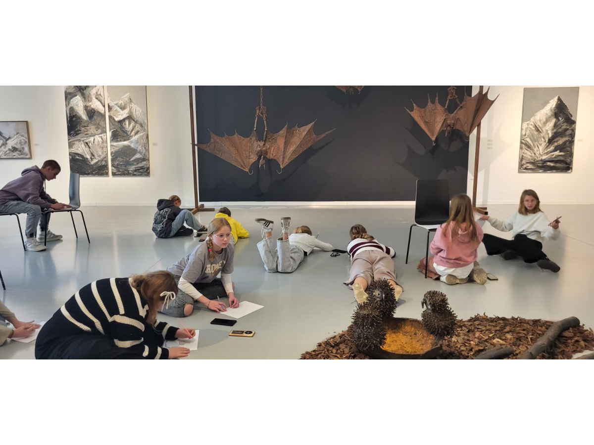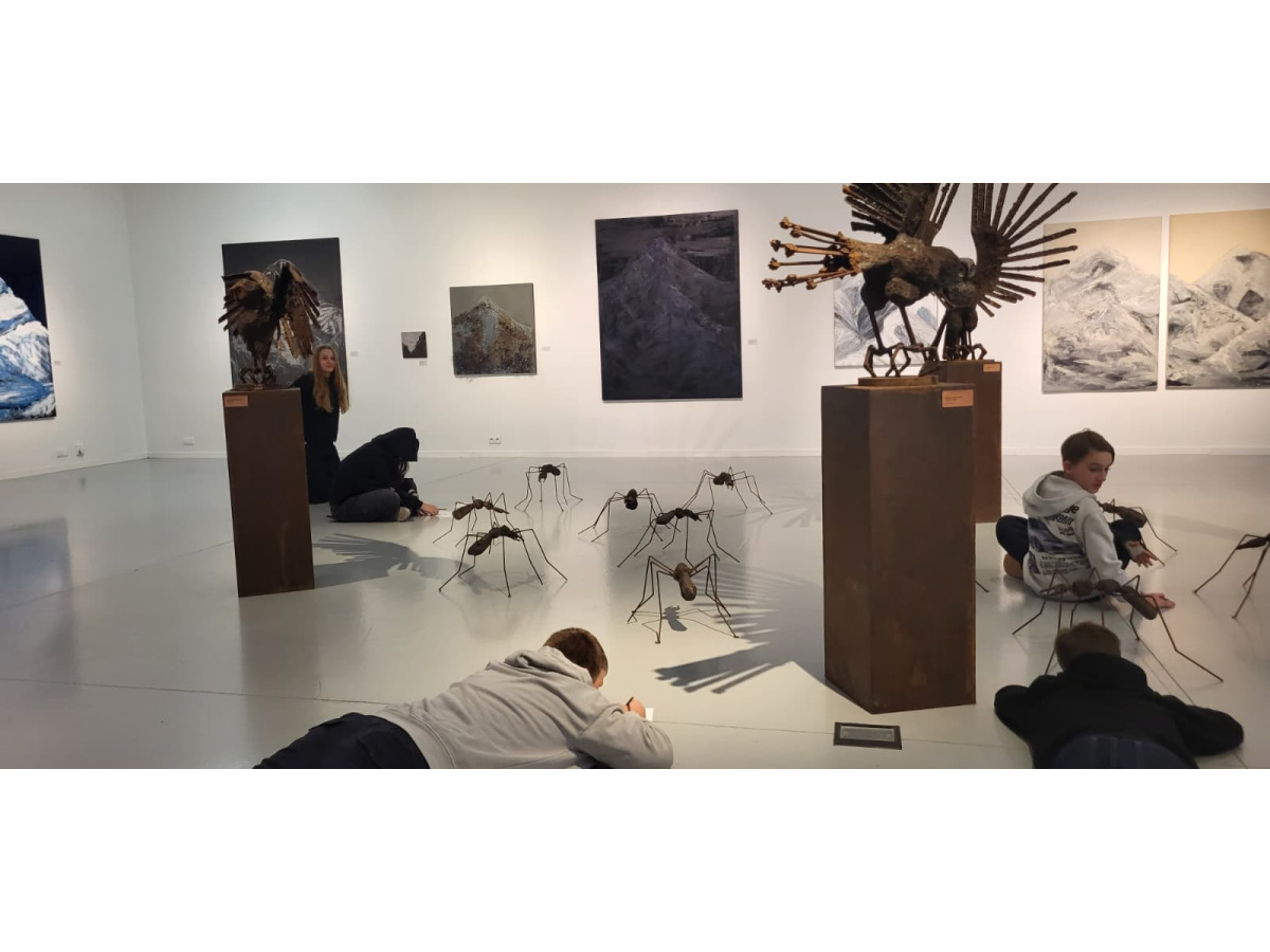 Podczas zajęć zwiedziliśmy wystawy „Nasłuchiwanie. Mariola Wawrzusiak – Rzeźba” oraz „Beata Zuba – Malarstwo”. Uczniowie dokonywali obserwacji i analizy dzieł sztuki, wykorzystując rutynę krytycznego myślenia „Widzę, myślę, zastanawiam się…”. Odpowiedzi na swoje refleksje odnaleźli m.in. w filmie dokumentalnym „Rdza”, a następnie wykonali szkice lub fotografie prezentowanych rzeźb.