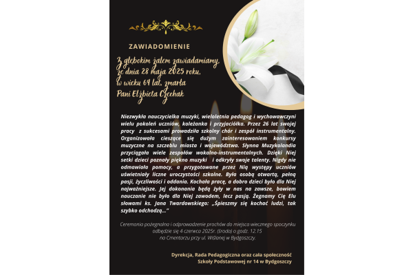 Dyrektor Szkoły Podstawowej nr 14 w Bydgoszczy przy ul. Żmudzkiej 12 informuje,