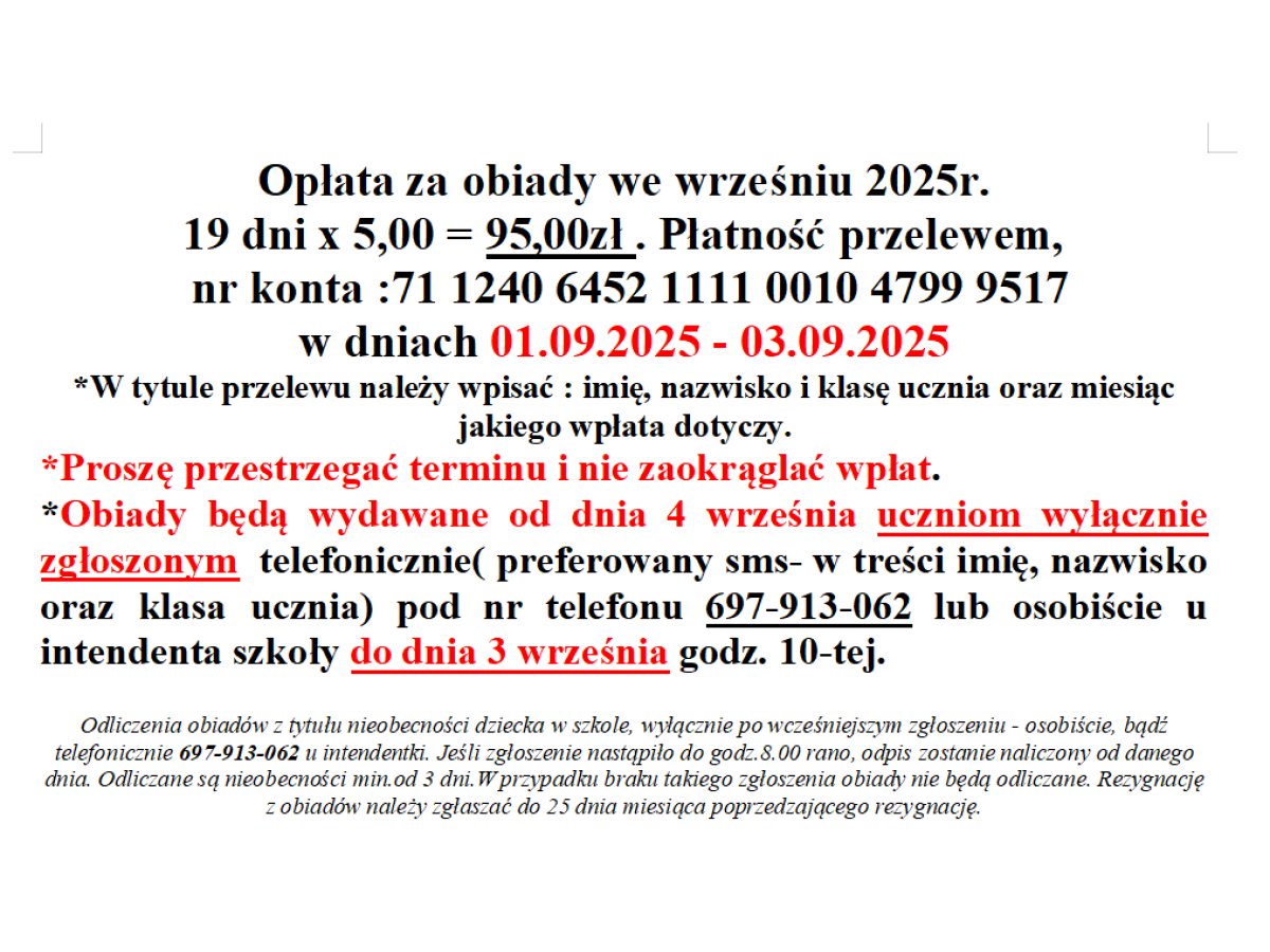 OPŁATA ZA OBIADY WE WRZEŚNIU