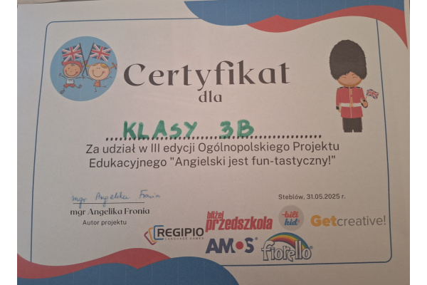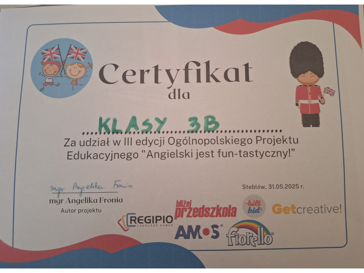 W roku szkolnym 2024/2025 uczniowie klasy 3b uczestniczyli w Ogólnopolskim Projekcie Edukacyjnym „Angielski jest fun-tastyczny”, którego celem było zwiększenie motywacji do nauki języka angielskiego. Dzięki różnorodnym i kreatywnym zadaniom uczniowie z entuzjazmem uczestniczyli w zajęciach, rozwijając swoje umiejętności językowe oraz poznając kulturę krajów anglojęzycznych. Na zakończenie projektu wszyscy uczniowie otrzymali pamiątkowe dyplomy.