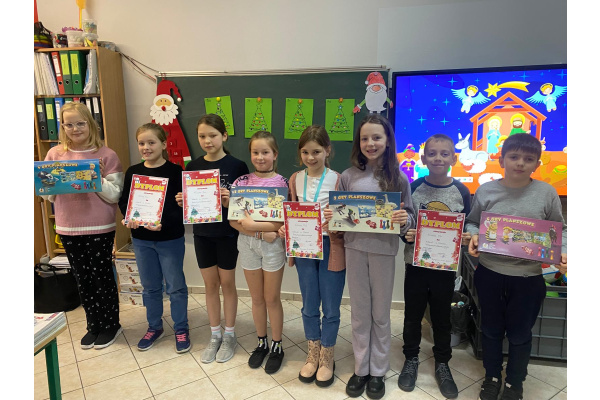 10 grudnia uczniowie klas drugich i trzecich uczestniczyli w quizie bożonarodzeniowym podczas którego mieli okazję wykazać się wiedzą na temat zwyczajów i tradycji związanych z Bożym Narodzeniem. Reprezentacje klas rozwiązywały świąteczne zagadki i zadania, wykazały się znajomością kolęd. Nie zabrakło również prezentów dla klas uczestniczących w quizie. Gratulujemy i życzymy magicznych, radosnych świąt Bożego Narodzenia