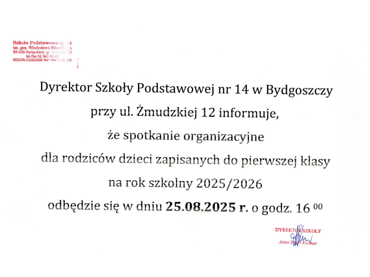 Dyrektor Szkoły Podstawowej nr 14 w Bydgoszczy przy ul. Żmudzkiej 12 informuje,