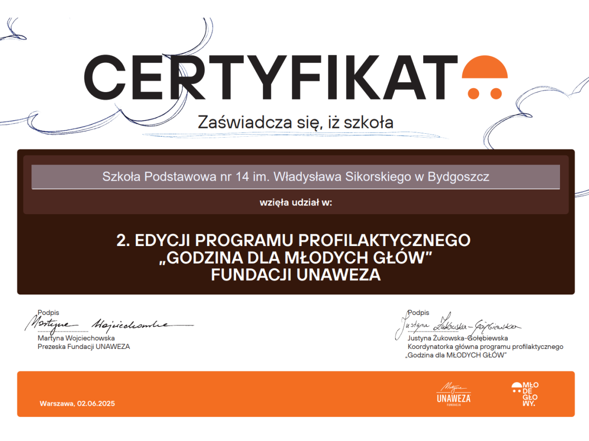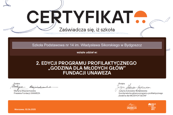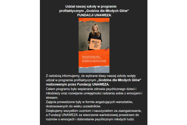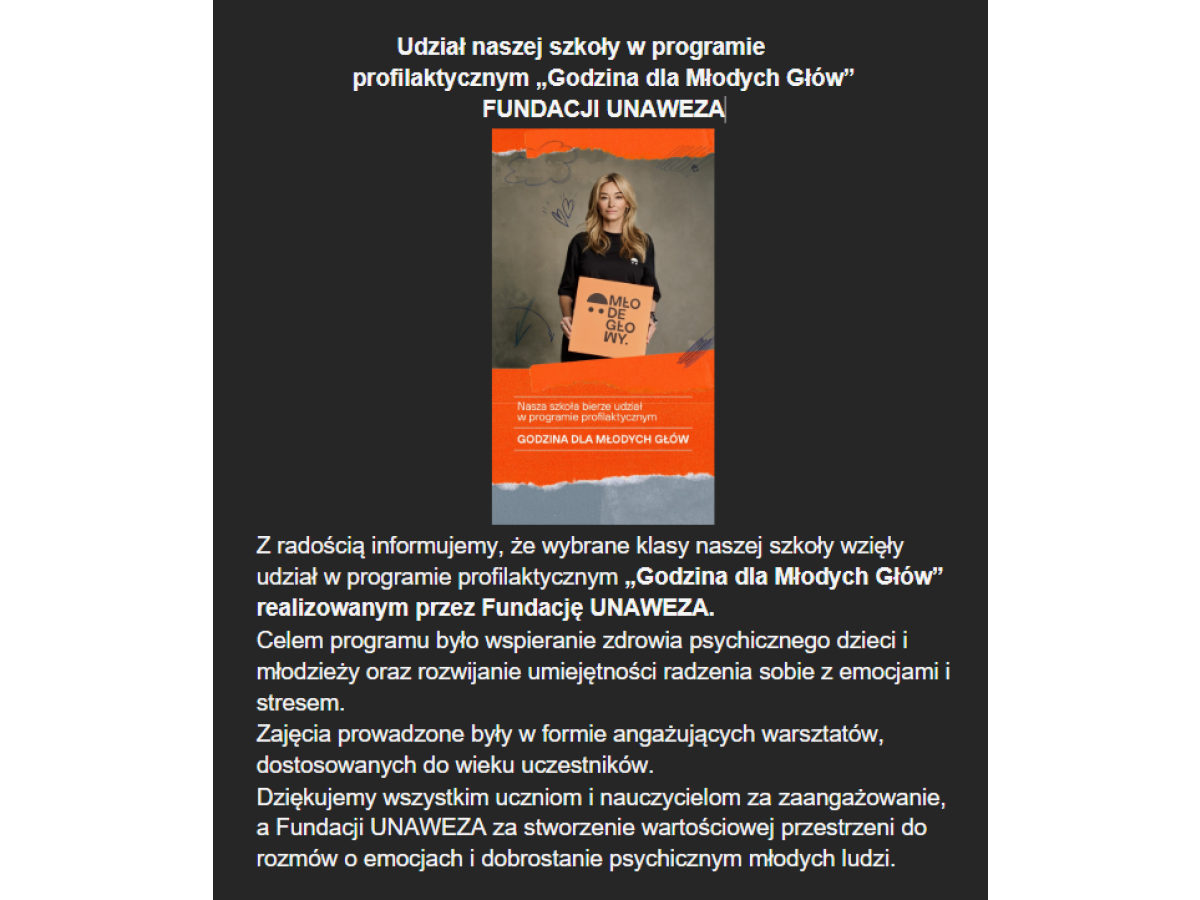 Udział naszej szkoły w programie profilaktycznym „Godzina dla Młodych Głów” FUNDACJI UNAWEZA