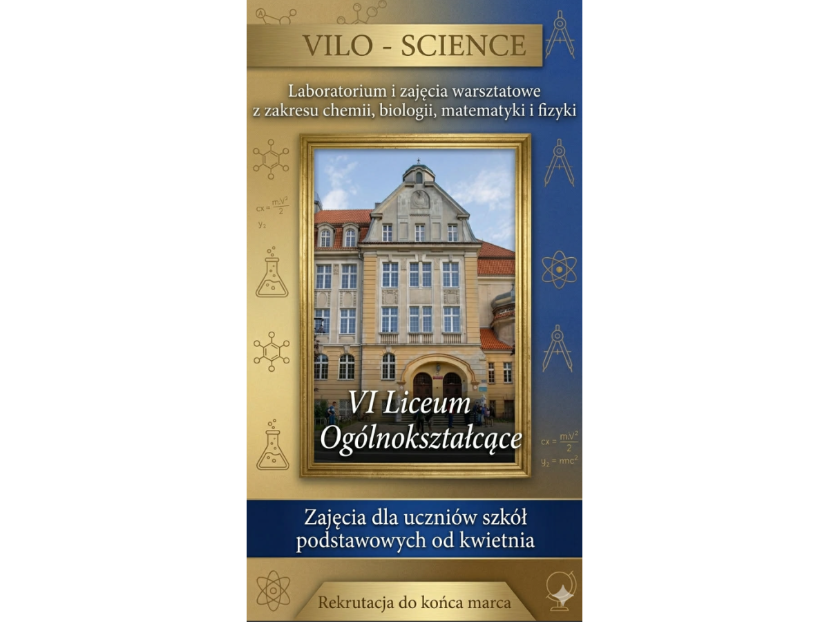 Pałac Młodzieży w Bydgoszczy prowadzi nabór do udziału w bezpłatnych warsztatach laboratoryjnych i zajęciach z zakresu chemii, biologii, matematyki oraz fizyki w ramach projektu „VILO – SCIENCE” realizowanego w ramach Grantu Rozwoju Zdolności w ramach Miejskiego Programu Wspierania Ucznia Zdolnego "Zdolni znad Brdy".