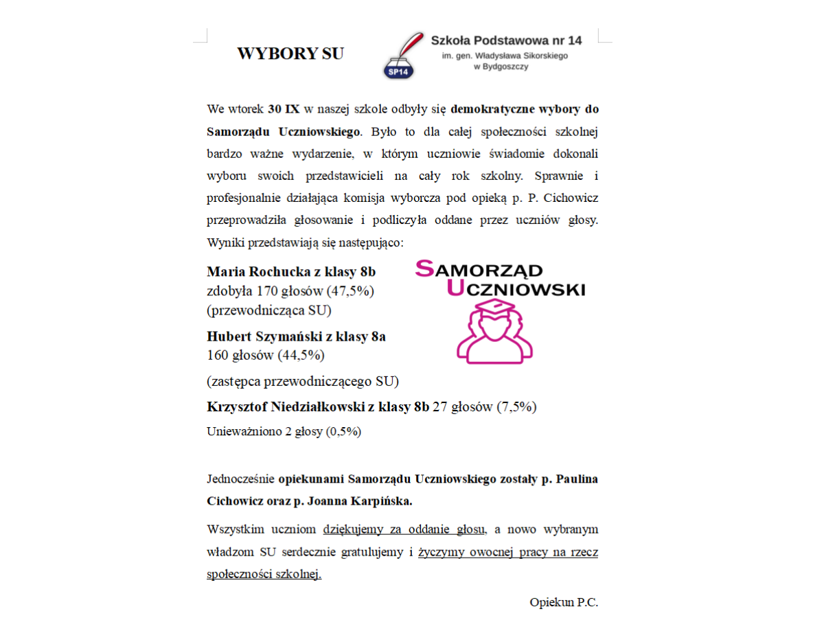 We wtorek 30 IX w naszej szkole odbyły się demokratyczne wybory do Samorządu Uczniowskiego. Było to dla całej społeczności szkolnej bardzo ważne wydarzenie, w którym uczniowie świadomie dokonali wyboru swoich przedstawicieli na cały rok szkolny. Sprawnie i profesjonalnie działająca komisja wyborcza pod opieką p. P. Cichowicz przeprowadziła głosowanie i podliczyła oddane przez uczniów głosy. Wyniki przedstawiają się następująco: